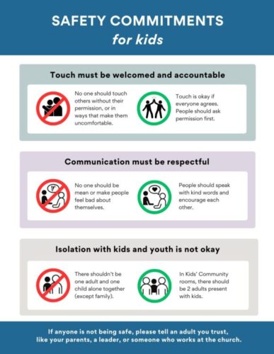 We recognize that children’s faith will best be able to grow within an environment that is physically, emotionally, and psychologically safe, and we aim to provide that. See our Children’s Ministry Handbook for details about our safety and security policies and procedures. These are in addition to our church-wide safety commitments. We have rephrased those commitments in kid-friendly language and that version, viewed below, is posted in all of our classrooms. We encourage you to review these with your children periodically to remind them what is safe and unsafe behavior.